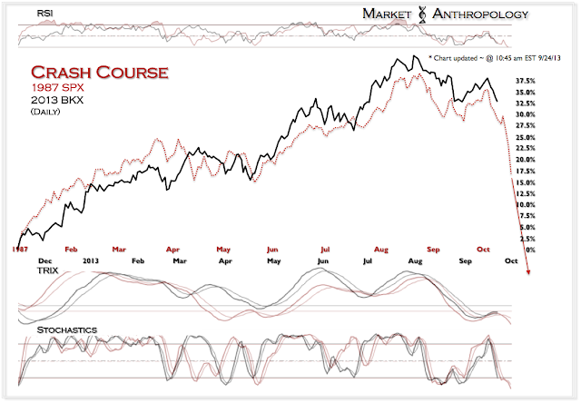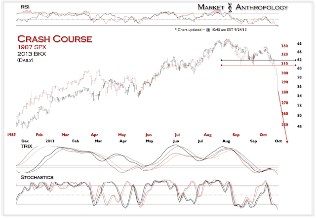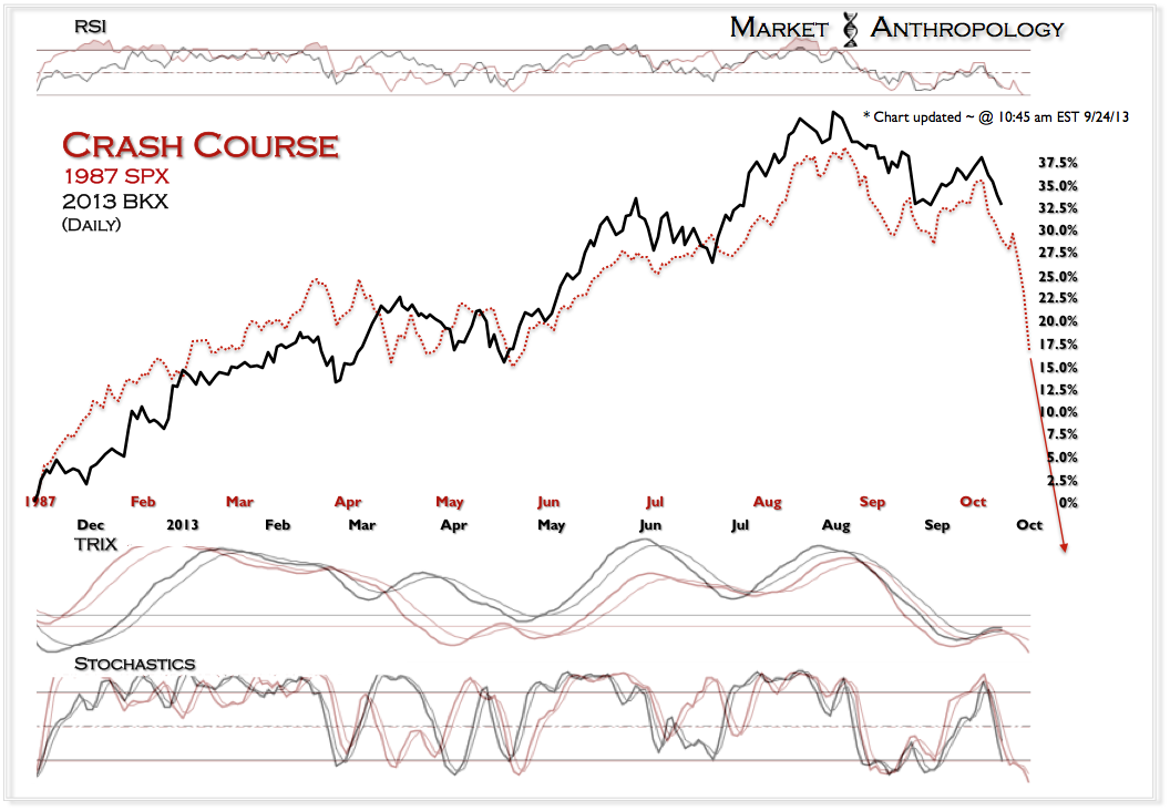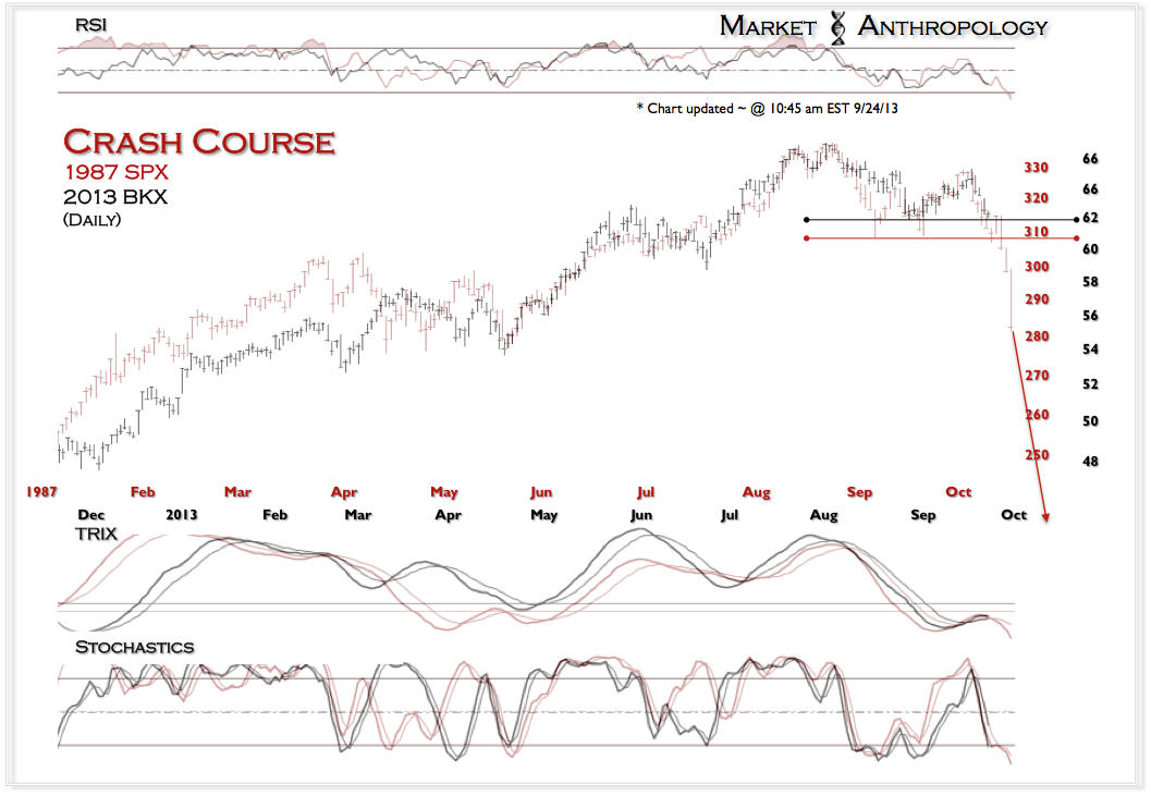Considering autumn is upon us, we had to fulfill our contractual agreement of including at least one crash scenario. In all likelihood, the BKX will find support where it currently traded down to this morning ~ 62 and continue on its merry way. Should it loose that support over the short-term, a more material correction is a higher probability for the equity markets.