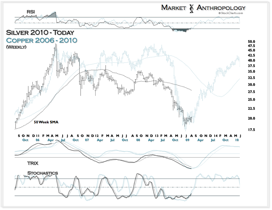 Buttressing this momentum is the swift recovery in the gold miners this week, which as of this morning have recaptured their 50 day sma. Having both silver outperform gold and their respective miners outperform spot prices is a significant change in character for the sector. Onward and upwards.