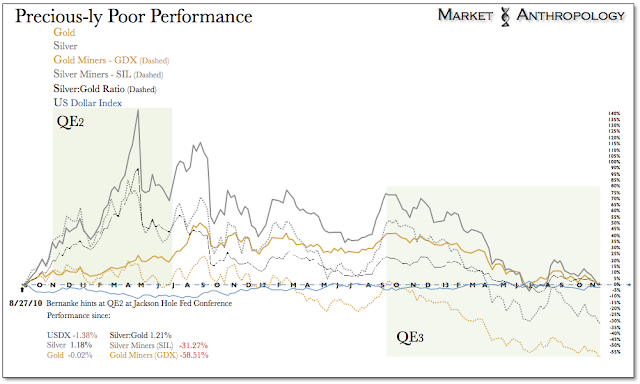 During the final blow-off stage for silver in April of 2011, we caught our fair share of criticism and rebuke for pointing out what appeared to be a terminal run for the silver bullet (see Here). We heard from many of the usual suspects that in one breath marginalized our analysis as nothing more than technical mysticism, then went on to cite truly false and misleading fundamental comparisons as rational for further gains. Rampant inflation, rampant quantitative easing – rampant debasement! With time as the great revelator – mostly rampant ignorance.