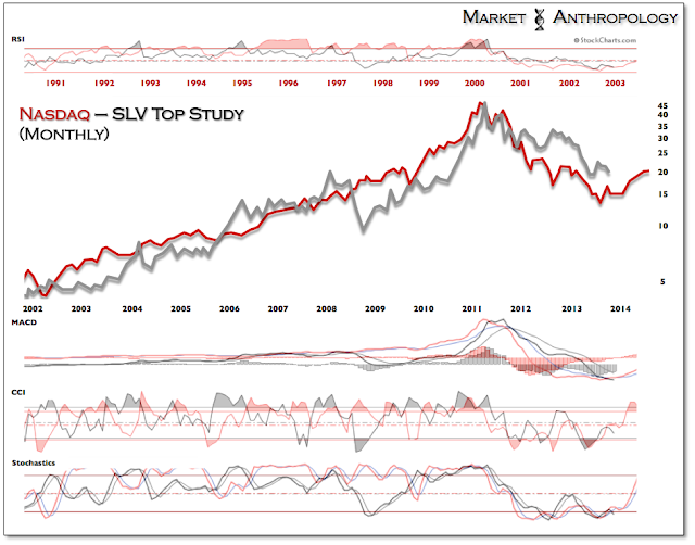 With that said and considering silver and gold have languished back towards their late June lows, we thought we’d check back in on a comparative chart we first made in May 2011 after silver had broken down. While we had relied on more acute comparatives as guideposts in the road during the initial break (Here, Here & Here) – we took a broad-brush look at the last great momentum cycle that culminated in the Nasdaq, circa 2000. Not surprisingly, the two assets – both from a momentum and relative performance perspective, expressed notable similarities.