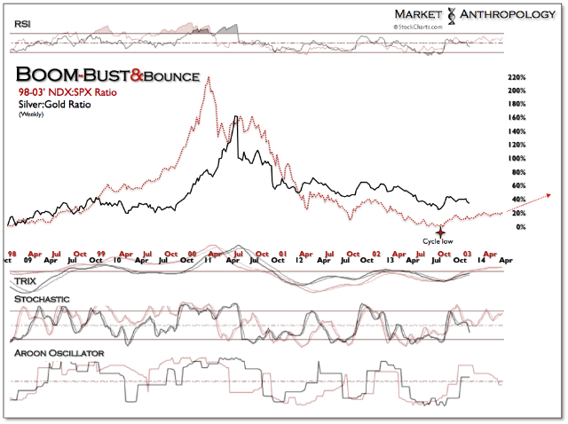 The ratio chart below for silver and gold was normalized by the momentum low prior to each parabolic build – rather than the asset highs of the comparison. Despite this, the concept of the asset cycle and prospective low stands very much the same.