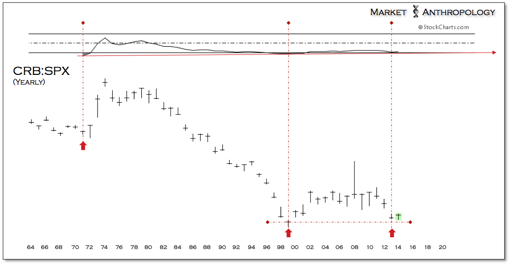 As we pointed out in previous notes (see Here), on a very long-term horizon the CRB relative to equities tested the secular low and found strong support. While the consecutive tapers by the Fed has provided monthly anxieties towards the investment thesis, the broader takeaway has seen assets tied to rising inflation expectations strengthen as the Fed moves further away from their extraordinary accommodative policies.