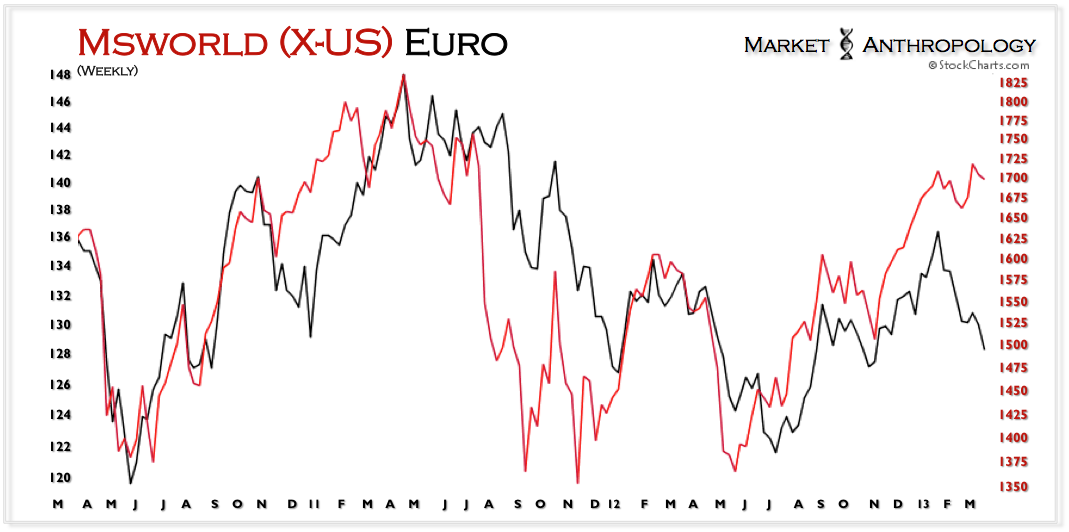 From our perspective, world markets (ex-US) have been discretely rolling over throughout the first quarter. Europe, the BRICs, Canada – you name a major equity market and it very likely turned down before or during the month of March. Collectively, that balance is expressed in the MSWorld market chart shown below and to the left. Perhaps we are colored by a certain bias, but see the dynamic primarily motivated by the US dollar’s newfound dominance, namely, in the face of a wounded euro and Europe. Downstream of the euro’s Q2 pivot (see Here) – world markets have yet to find the same traction the SPX has enjoyed. It isn’t a causal coincidence to find the correlation, considering the burgeoning emergent economies so closely tied to the commodity cycle – and the fact that Europe is China’s largest trade parter.