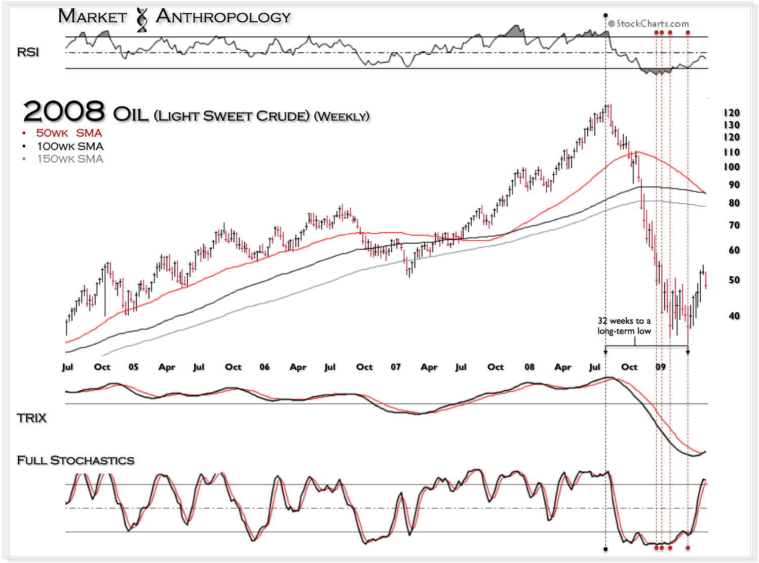 Like Apple, oil never quite came up for a breath on its way to a long-term low – some 32 weeks after its cycle high. This persistent selling pressure was reflected in a severely impacted RSI that eventually (on its fourth positive RSI divergence) made a long-term low.