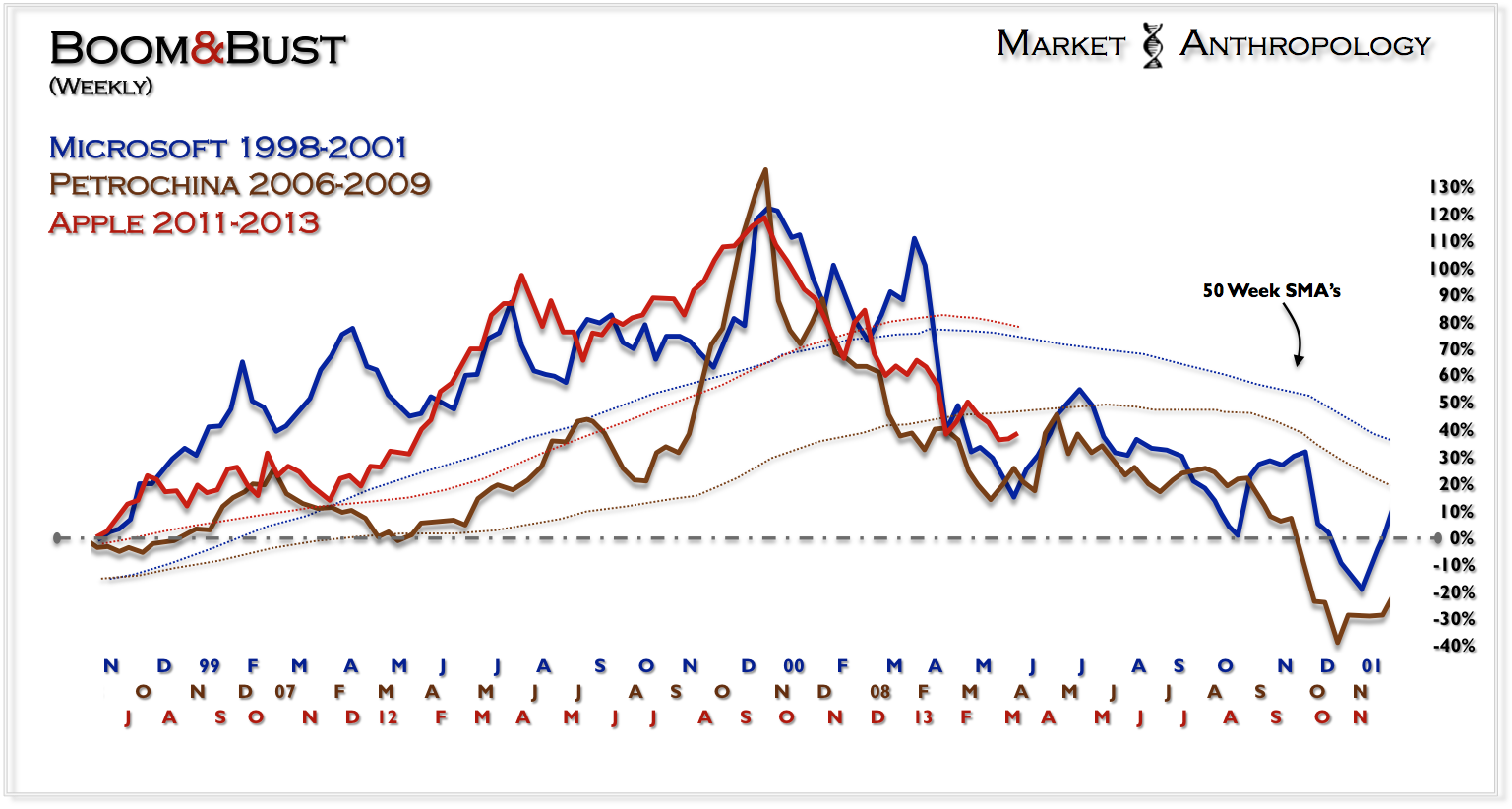 Both Microsoft and PetroChina broke-down roughly along similar timelines and with like price and momentum structures. Approximately 21 weeks to an intermediate low at their respective 150 week SMA’s – and approximately 1 year to exhaust the down cycles. Each weekly low was also accomplished with successively lower RSI imprints.