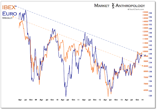 In one of the last strong intermarket correlation trends remaining intact since the financial crisis ruptured, simplicity has reigned supreme when it comes to evaluating trends between Spain’s equity market and its native currency. In what became a tale of two Europes, the southern countries most susceptible and impacted by the sovereign debt crisis – such as Greece, Spain and Italy, were also the equity markets most closely correlated with the relative standing of the troubled and enigmatic currency. In existential terms – although counterintuitive to most analysts and monetary handicappers: so went the euro, so went the relative wealth of Spain, Greece, Italy, etc.