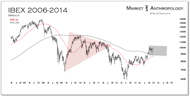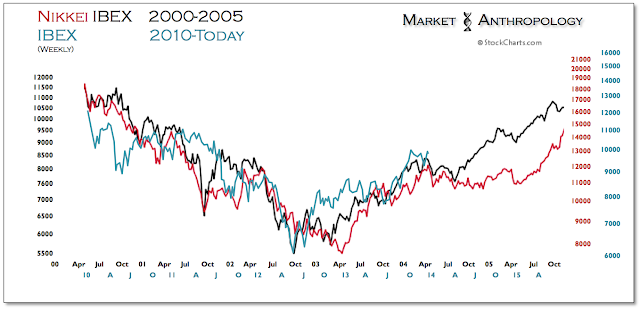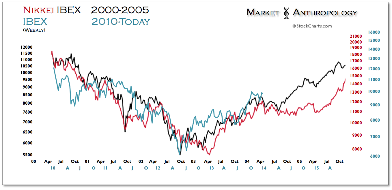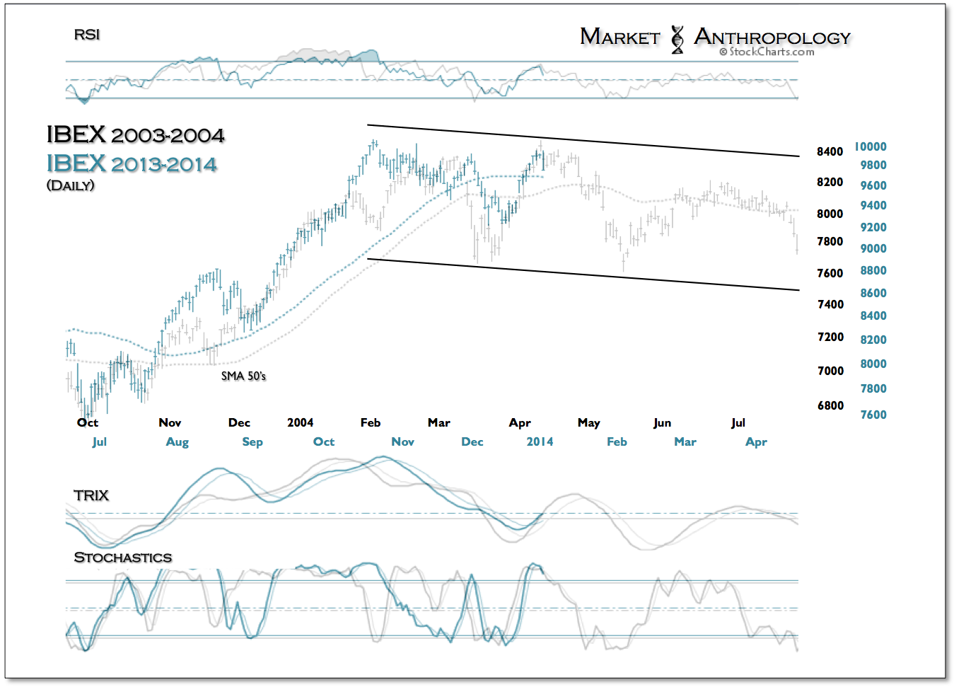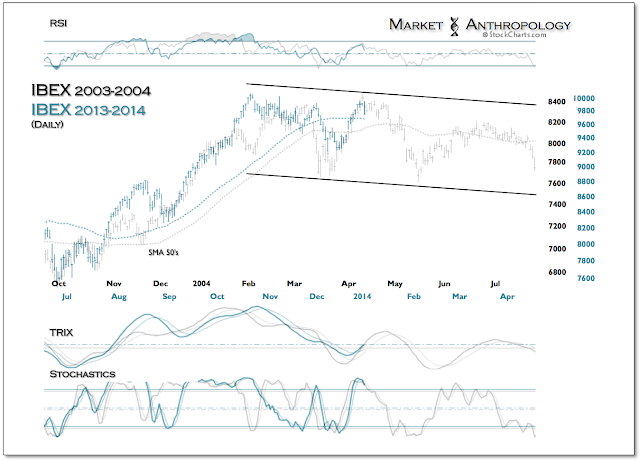 Over this past summer and fall we contrasted a comparative guide for Spain from its previous breakout leg from 2003-2004 (see Here) that presciently placed the current market very close to where it currently resides. Today, however, we recognize the considerable hurdles for these southern European economies and governments and expect the next chapter could be less sanguine and more along the lines of what has become a guide for us for the enigmatic euro and Europe’s broader deflationary and structural hurdles – namely Japan, circa 2003/2004. Although we are more agnostic with our long-term outlook on Spain than outright bearish, we suspect the consolidation range will continue before the possibility of a resumption of trend higher.