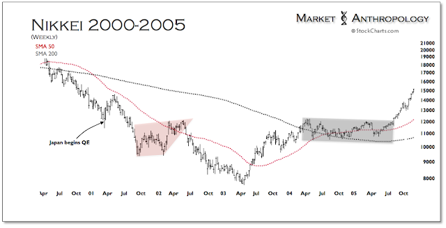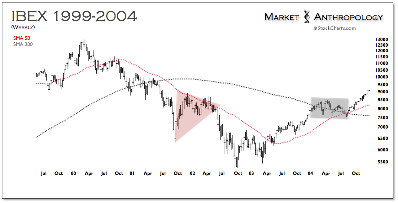 As shown below in the historic reflationary charts of Spain’s IBEX and Japan’s Nikkei from the previous equity cycle lows, the new uptrends both consolidated at the retracement hinge of the culminating denouncement structures. Should the current uptrend for the IBEX reestablish itself, we believe it will likely be somewhere between the consolidating range of the historic IBEX and Nikkei markets. That being said, we would guess that a longer and more drawn-out range is more likely, considering the parallels of structural and psychological support that was needed and extended to the market in Japan with QE starting in 2001 and continuing through 2006 – and the support established by the ECB to markets such as Spain with sovereign debt purchases in southern Europe in 2010 and 2011.