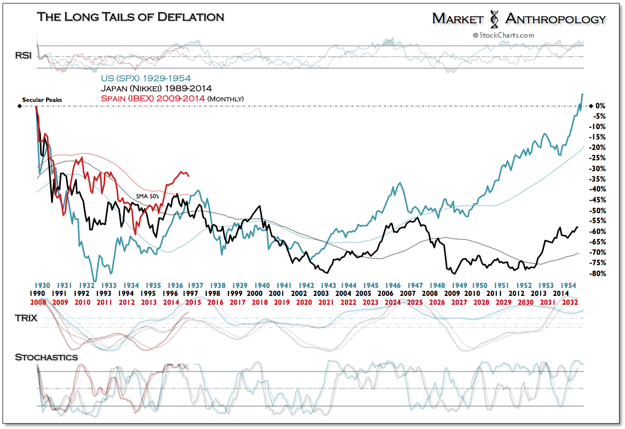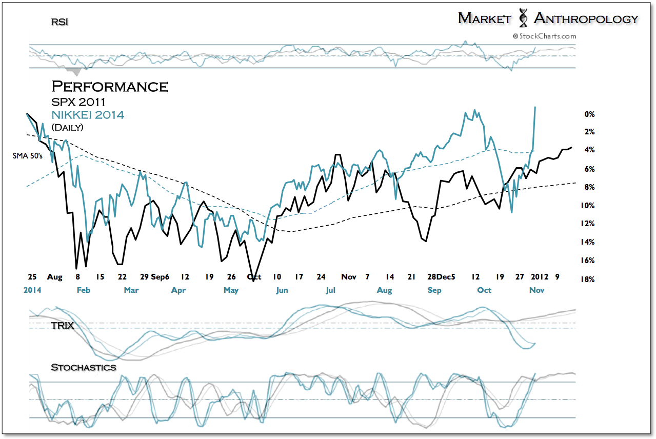 Our general outlook for the Nikkei this year has been that the rally that began with the commencement of Abenomics at the end of 2012 became stretched to a relative extreme and that the breakout leg for Japan and perhaps its perennial battle with deflation would occur at a lower level (technically) and after another subsequent correction. That correction has materialized this year with the Nikkei underperforming almost every major market in 2014. – The Long Tail of Deflation