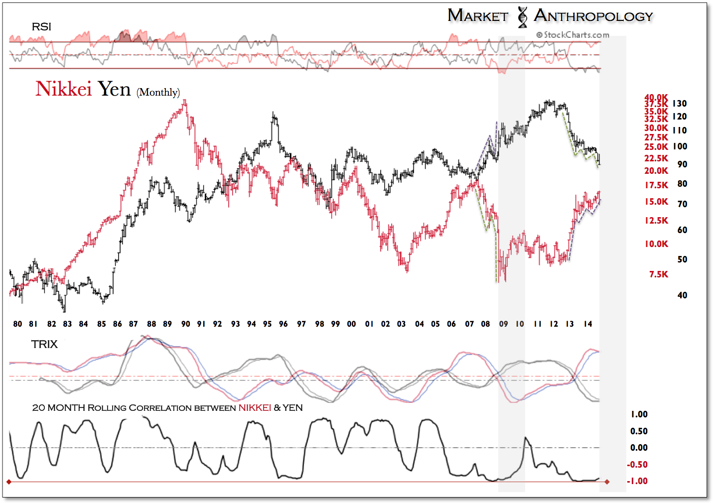 As a postscript tie-in between our more bullish leanings in precious metals (gasp) and our continued favorable outlook in Japan, we believe the two market postures can be reconciled, when appraising the long-term correlation trends between the yen and the Nikkei.