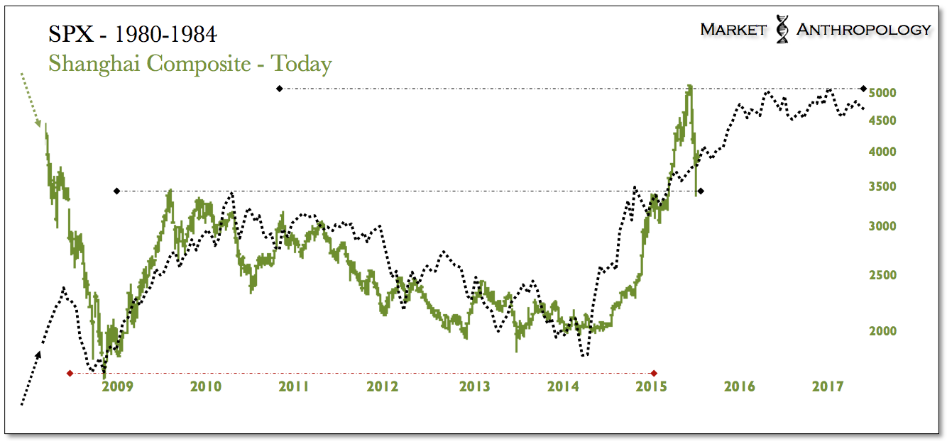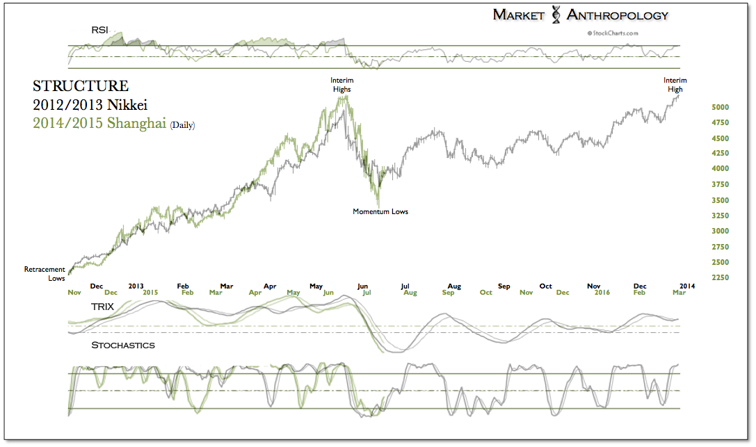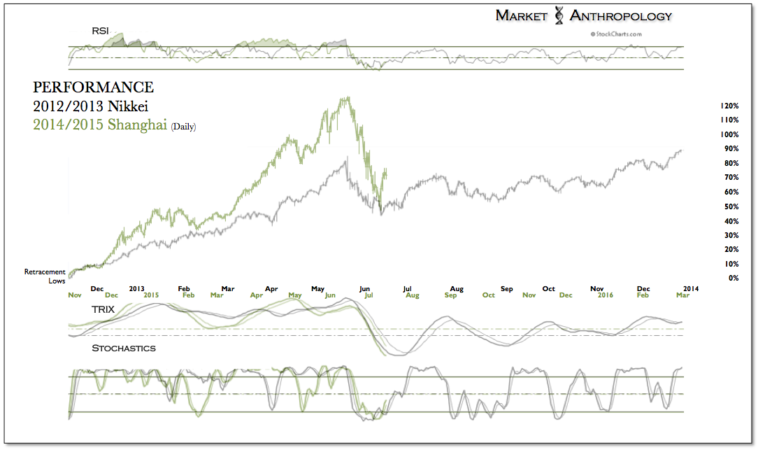 In hindsight, the breakdown in the Shanghai now resembles the initial break in the Nikkei in May 2013 – subsequent to the rollout of Abenomics in Japan in the fall of 2012. During that period, the Nikkei rallied nearly 90 percent in less than 7 months, on the back of broad stimulus initiatives – before eventually retracing 20 percent over just 16 sessions.