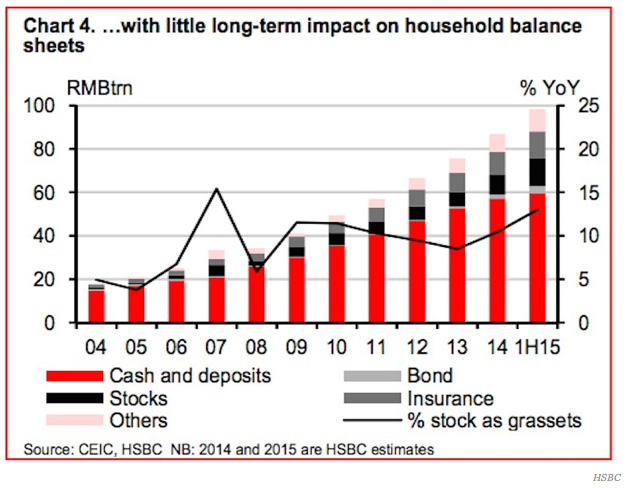 Prospective, because although the media has remained fixated on how many retail accounts were opened in China over the past year, retail traders represent just 4 percent of the total population and stocks currently account for less than 15 percent of all household assets. While in the short-term a continued market decline may lead to painful losses for the retail-come-lately crowd, total margin positions are equal to only 3 percent of total household bank deposits. Seemingly lost in translation is the paradoxical fact that although the Chinese are widely viewed as avid speculators – they are among the worlds greatest savers with a stash of cash worth nearly 50 percent of China’s GDP. Comparatively speaking, the US holds less than half – coming in last year ~ 17 percent of its GDP.