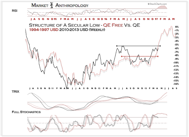 While I am impressed with the Chairman’s conviction and fortitude in persisting down a path he clearly defined over a decade ago, I find myself with increased skepticism towards many investors perception of its perennial influence – that closely correlates with my comparative work with trends, analogs and historical market data. What many in the financial punditry will describe as an obvious cause and effect – is more than a little bit nuanced when you step back and gauge the broader environments the Chairman has created monetary policy in. During the prior salvos of QE in 2008, 2009 and 2010 – the commodity cycle was still cresting, thus, emerging global growth (BRICs) remained elastic; China was growing at a double digit pace – and the US dollar was still searching for a long-term low.