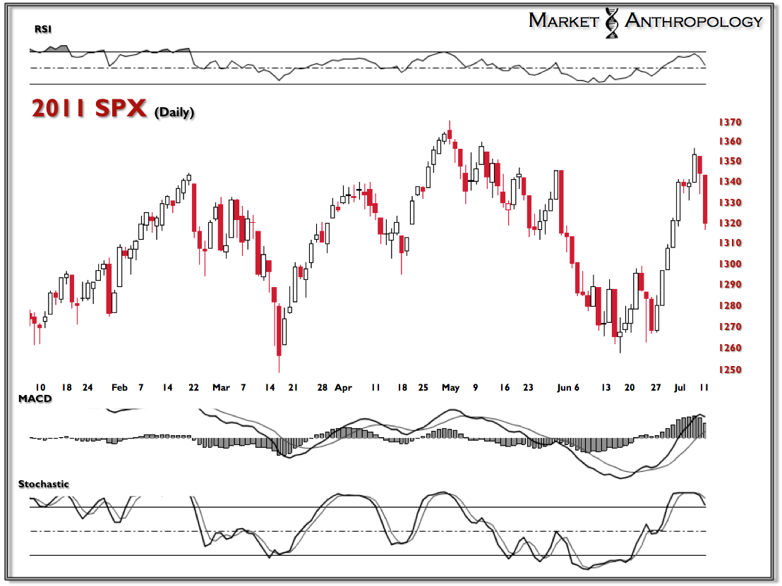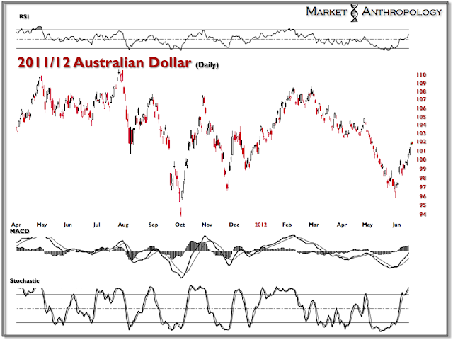 Over the past few months I have been following the 2011 SPX analog as the Aussie has been working through the complicated, yet now discernible pattern. One could speculate that the SPX completed a momentum top last spring, while the Aussie has been working through the same process – just along a much broader timeframe. Although fundamentals certainly can explain the story in an abstract of historical perspective – I continue to find the presence of fractal geometry, in both the short to intermediate time frames, expressing risk and momentum profiles – quite vividly and with more accuracy than the fundamentalists have you believe. But again, and as Mandelbrot repeatedly found out, the fundamental story just goes down easier to John Q. Public – than a snapshot of the DNA of the cosmos.