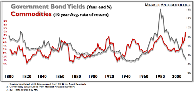 As I have presented in previous notes, while the effects on asset prices have mimicked to an extent both the deflationary and inflationary asset spirals of the 1930’s and 1970’s – the closest parallel to a troughing interest rate environment, coupled with a cresting and declining commodity cycle is likely found in the 1940’s – post WWII.