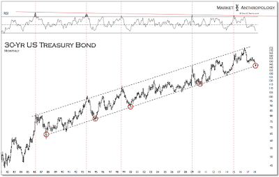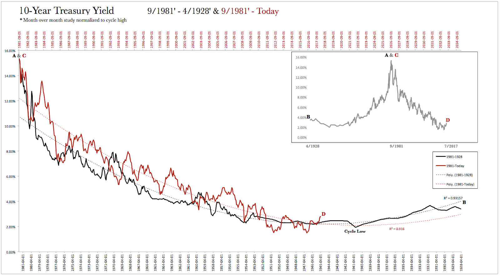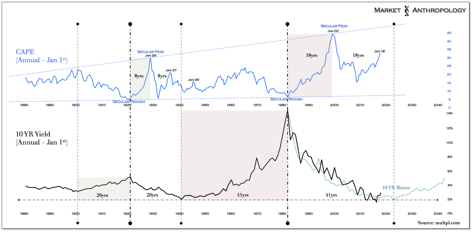 For example, the previous long-term cycle (as measured trough to trough – annually) stretched 40 years, with estimates of a symmetrical retracement decline of the current cycle stretching over two times that span. Considering the fact that every long-term cycle has trended below the previous over the past several hundred years, it’s not a stretch to believe the current span could extend even greater than twofold as long. Furthermore, the move in CAPE from its secular trough in 1982 – which also corresponded with the secular high in yields – to its secular peak in 2000, is 2.25 times the span of the previous cycle between 1921 and 1929. Applying this ratio to the span of the previous cycle between the secular valuation high in 1929 and the secondary high in 1937 (8×2.25), brings us to a secondary high in 2018 – as measured January 1st of each year.