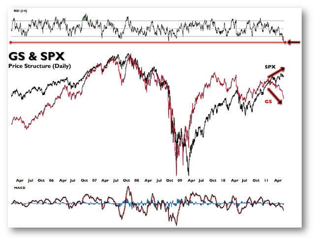 Great relative strength for the broader market in the face of deteriorating financial support. Historic lows on Goldman’s daily relative strength index (RSI). Lower than even during the financial crisis in 2008. Looks primed for a bounce – but buyer beware. The last time it traded this weak on a relative strength basis was right before the bottom fell out of the market in the fall of 2008. A more equal comparison of market conditions (in that GS dislocated from trend) was last May when the SEC investigation broke. The market held up for a few days before it followed suit. What is troubling about today is how long Goldman, and for that part, the financials – have been trending away from the broader market.