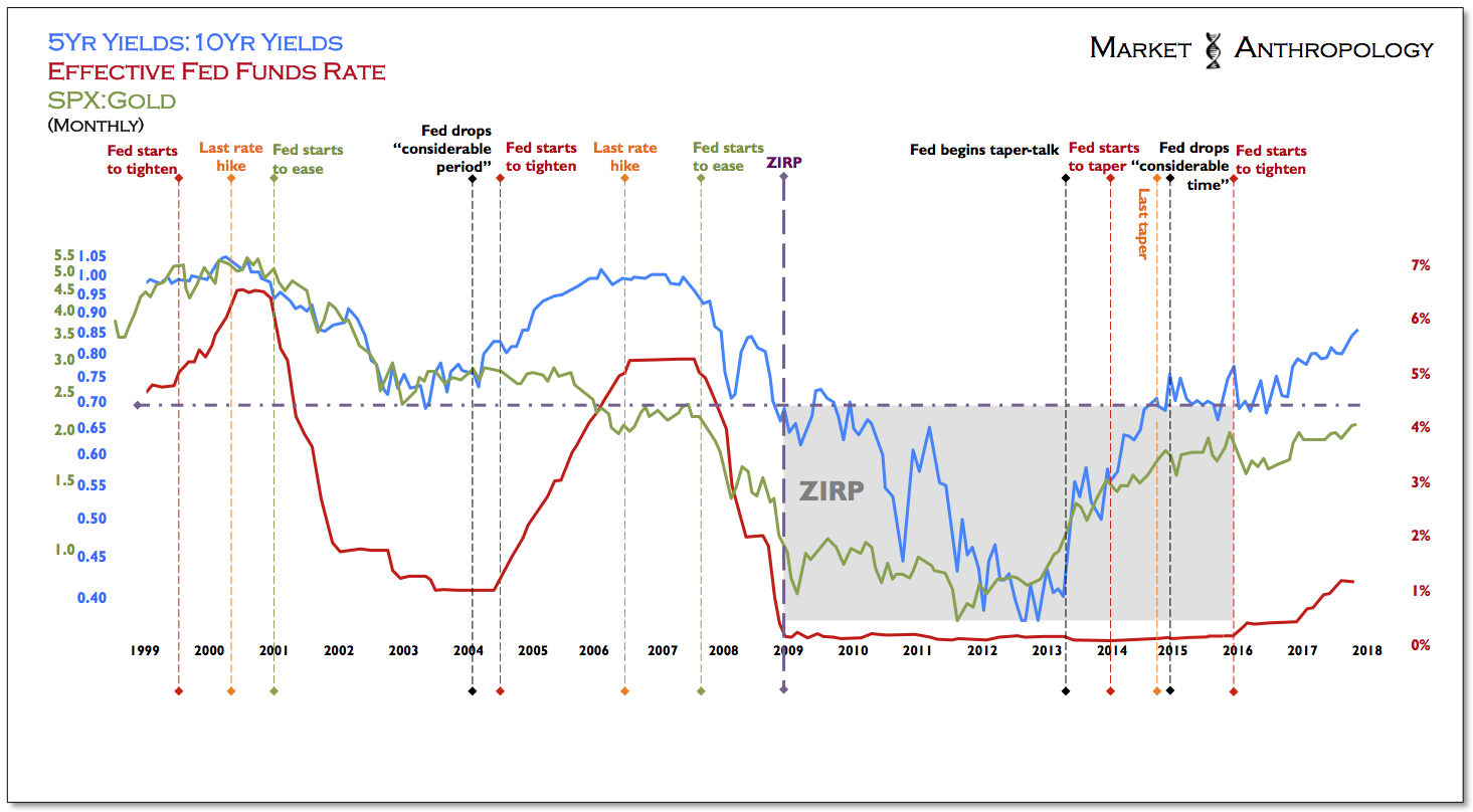 *Contrary to the previous chart shown, the chart below uses the inverse series (5yr:10yr & SPX:Gold) as they have historically trended with the Fed funds rate.