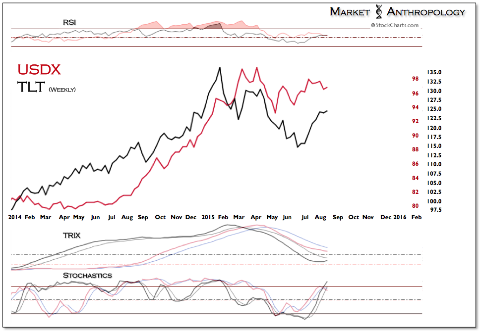 Long-term Treasuries appear poised for a downside reversal – and are completing a similar descending topping pattern, evident in the two previous multi-year Treasury rallies. We maintain our expectations that the 10-year yield will challenge overhead resistance around 2.65 percent later this year and see the US dollar index following suit lower – which should provide an exit for commodities from the dead end street they’ve remained in since Q2 2011.