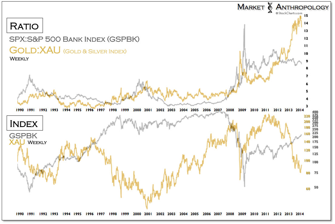 The study was normalized to the secondary highs preceding the downtrend pivot for each ratio – a ratio that was understood as a leading proxy for the underlying sector. The XAU Philadelphia Gold and Silver Index was chosen as a more representative basket for the overall gold and silver space – and the BKX Philadelphia Bank Index was used for the financial sector. The denominators (gold and the SPX) were chosen as the least volatile representatives for each sector.