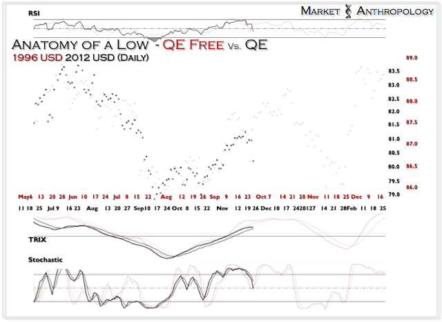 The US dollar index continues to work within the pattern’s proportional envelopes – both of price and momentum. Should the pattern continue to be prescient, the swift move lower today will be recaptured early next week.