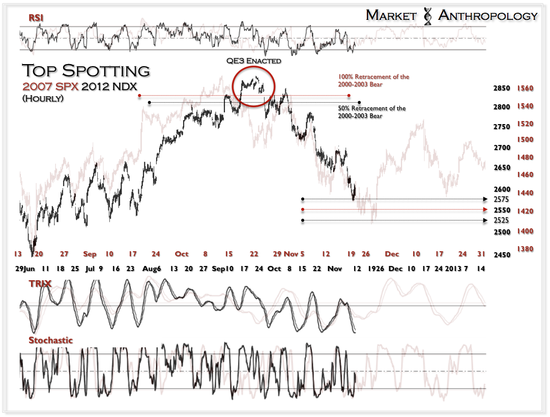 The Nasdaq/S&P 500 comparative continues to closely follow the arc of the 2007 S&P 500 top – with this cycles Petrochina (last Here) being played out by the now exhausted parabolic mega-cap of Apple. Should the analogy to the previous two peaks on the SPX continue, the bull’s ship at best is packed, and at worst – departed.