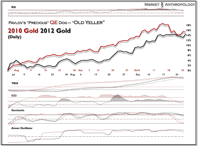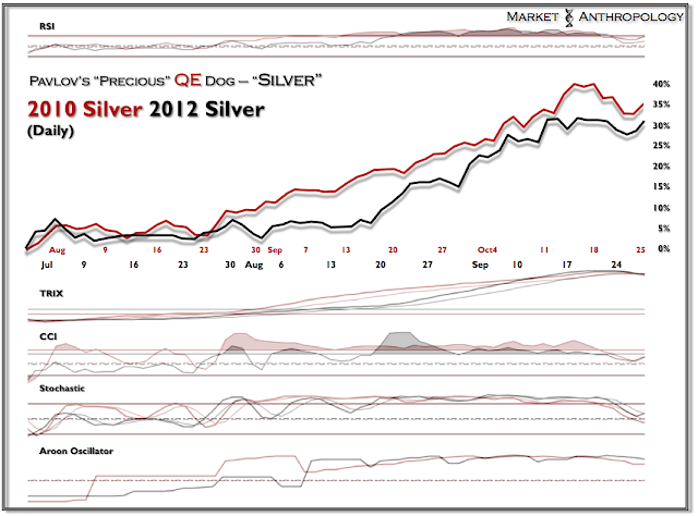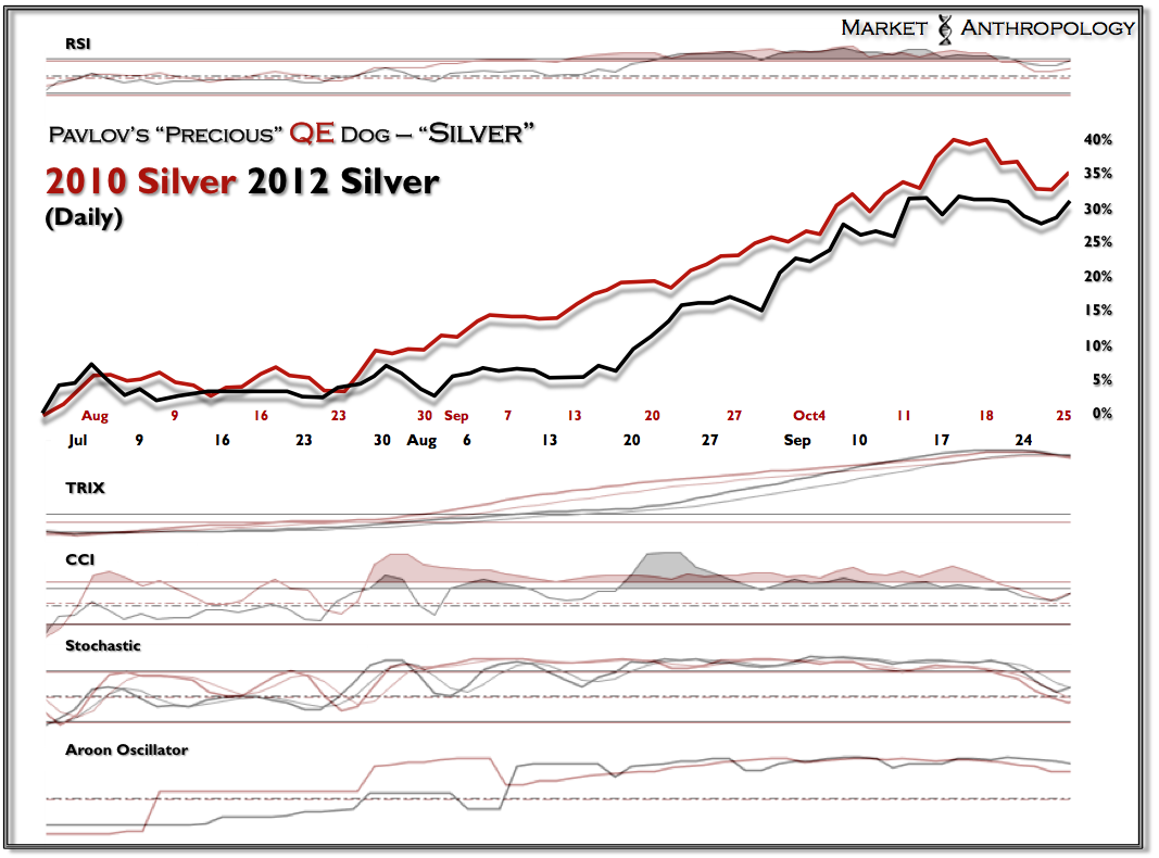 Here is an update of Pavlov’s QE dogs. The performance durations are the same – starting from each periods respective summer low. Considering silver typically exhibits the most emotional nuances of risk appetites and aversion, it was chosen to define the period low.