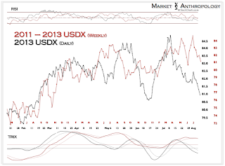 Below are a few updates of the patterns and fractals we have been following for the USDX – which continue to point towards long-term weakness and a gradual roll over for the index.