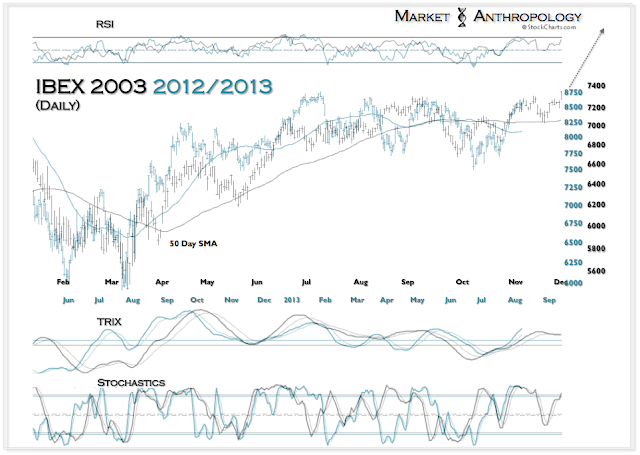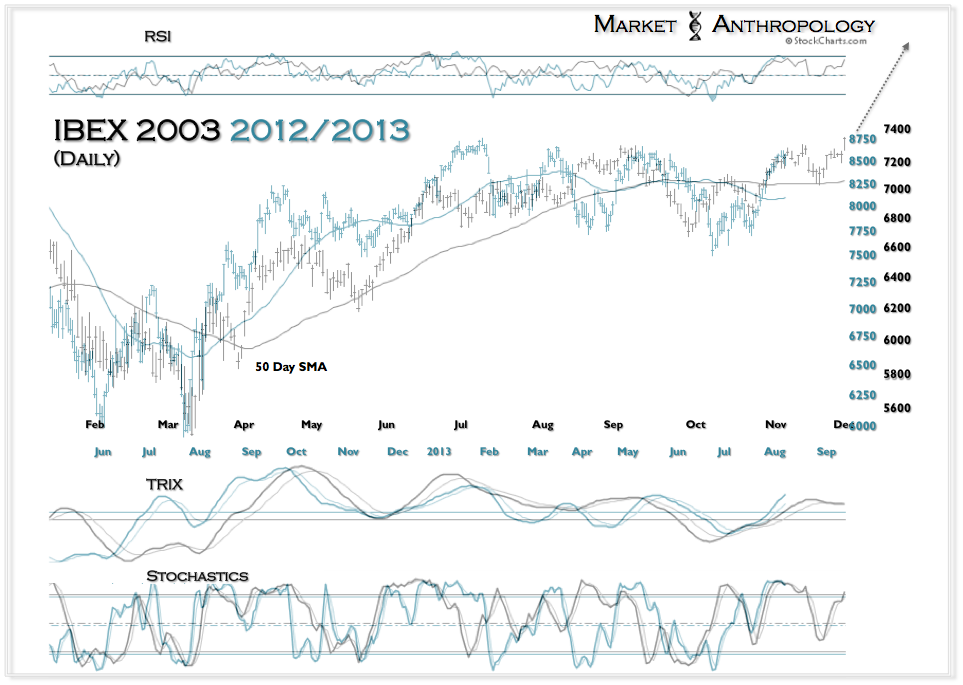Reinforcing the USDX’s vulnerability is the surprising strength displayed overseas in Europe, as shown below in Spain’s IBEX index which continues to trend away from what appears to be a major low last summer. While we had our doubts last fall that Spain’s troubles were behind them – the market has climbed through those concerns, very much along the lines of its previous long-term low in 2002/2003.