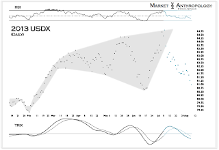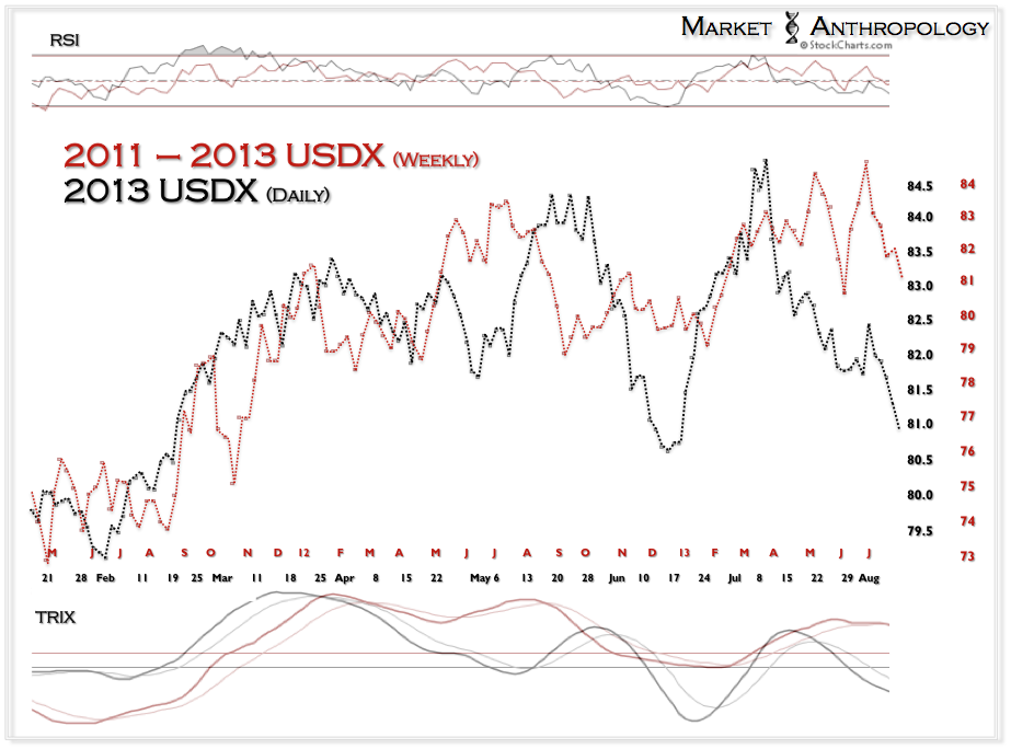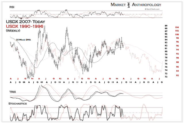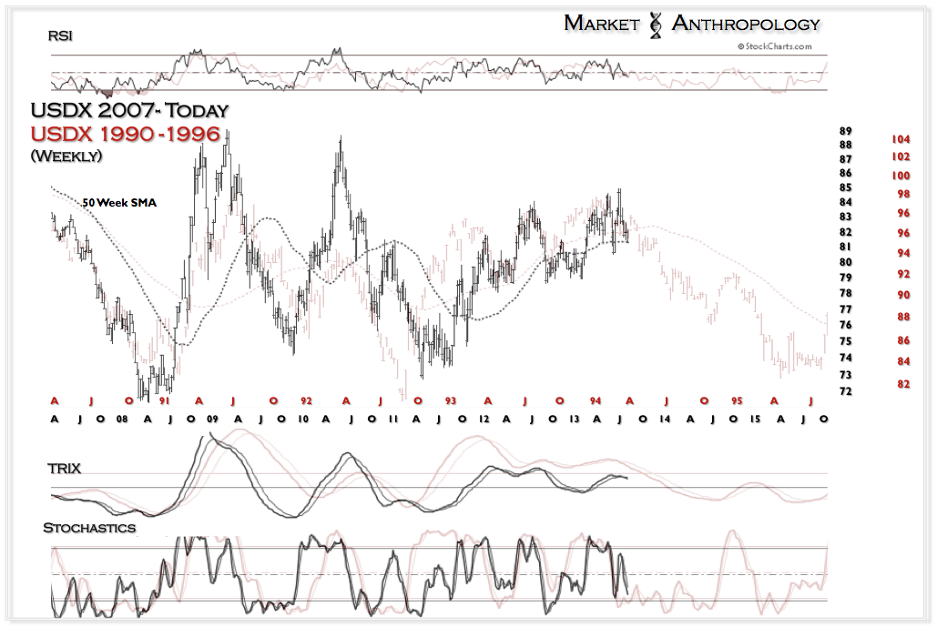 As we have shown in our previous notes, both the last two cycles (94′ & 04′) where the Fed have shifted postures away from accommodative monetary policies, the USDX has weakened. Below is the 1994 comparative which presents a similar long-term structure and momentum profile for the index today.