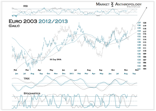 Below is a euro comparative for the above time period which was fit based on the IBEX chart. The takeaway for us is that perception trumps the considerable shortfalls in the euro’s structural underpinnings here, and that as long as the eurozone continues to move away from disintegration on the visible horizon – the euro will find support with Europe’s recovery.