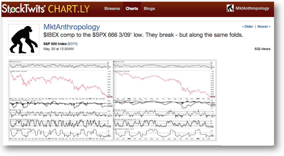At the end of May as Spain’s IBEX was cascading below their 2009 lows – to 9 year lows, I contrasted the index to the SPX in March of 2009.