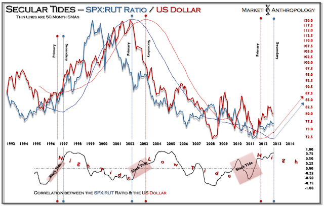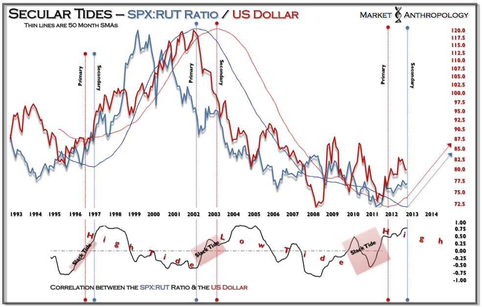 Below are two identical charts that I have been following this year, contrasting the US dollar index and the large cap/small cap ratio as expressed by the SPX:RUT. For purposes of expression, the first chart has been stripped of the actual monthly data – leaving behind each respective 50 month SMAs.