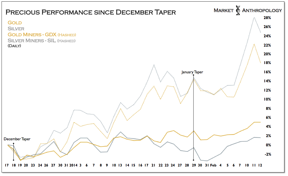 Back in October and November of last year, we speculated that the conventional wisdom going into a prospective taper was widely being viewed by participants through a broken prism. When Goldman declared gold a “slam dunk” if and when the Fed pivoted from their policy stance, we greatly disagreed and considered the taper broadly “bullish” towards inflation expectations and those assets closely associated with what we perceived to be a gathering reflationary tide.