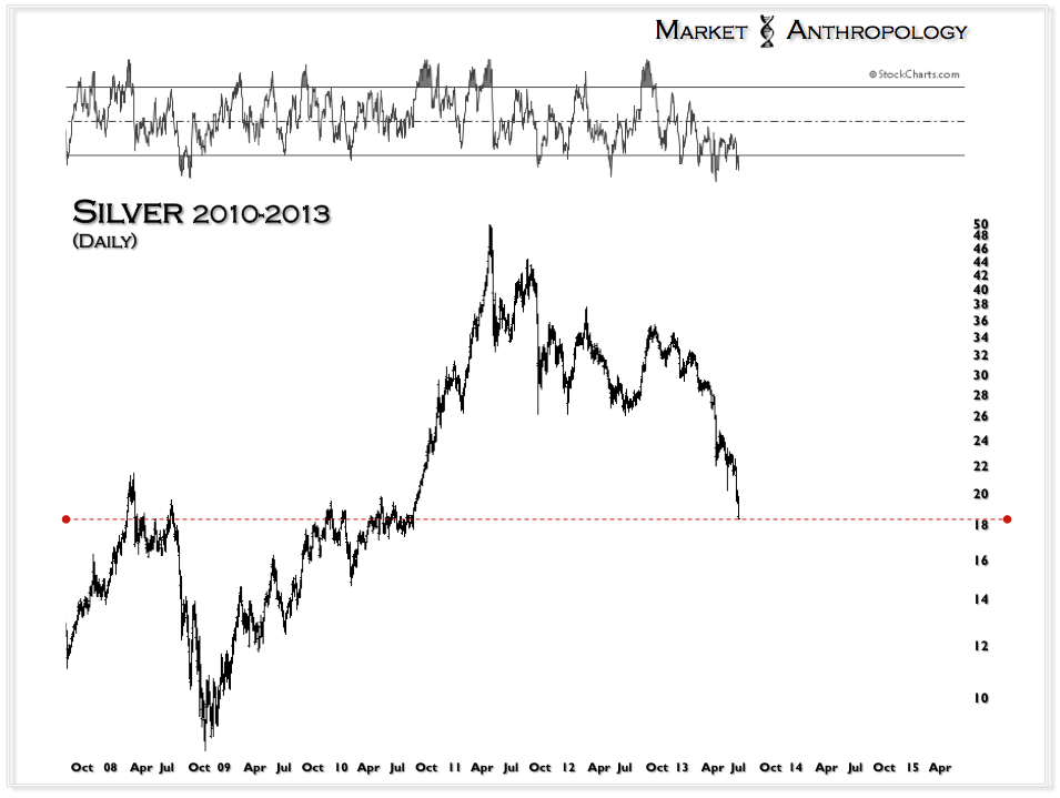 Moving further down the road to the bear den we once inhabited, we see that the Nouriel Roubini’s of world are likely following the same fallacies they applied towards downside targets in the equity markets in 2009, in extrapolating the culmination and capitulation of positions in precious metals – likely at or near the bottom. Far from absurd, we can recognize aspects of their logic in seeing spot prices significantly below where they currently reside. As example, we had up until recently expected the bear market in metals to extend far into 2014.