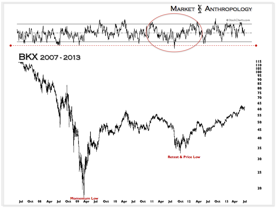 Back in 2011, a similar market and sentiment environment was spawned in the financial sector as the banks careened lower and tested participants moxie in the shadow of the financial crisis. As we recall, the general sentiment at the time – both within the trading and the pundit class, turned overtly bearish on the banks just as they were completing their cycle lows. The thought of buying Bank of America and Citigroup for anything more than a quick trade was seen as reckless and foolish by analysts and pundits so keen on extrapolating current market conditions forward. From a purely psychological perspective,  the retest is often as difficult to navigate and appraise as the initial crisis itself – due to the long tails of the recency effect.