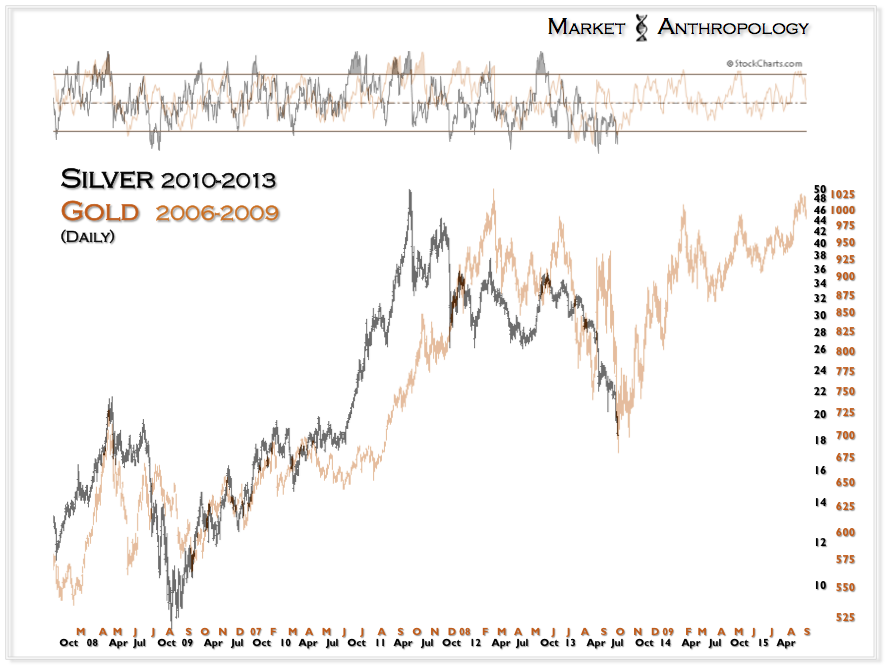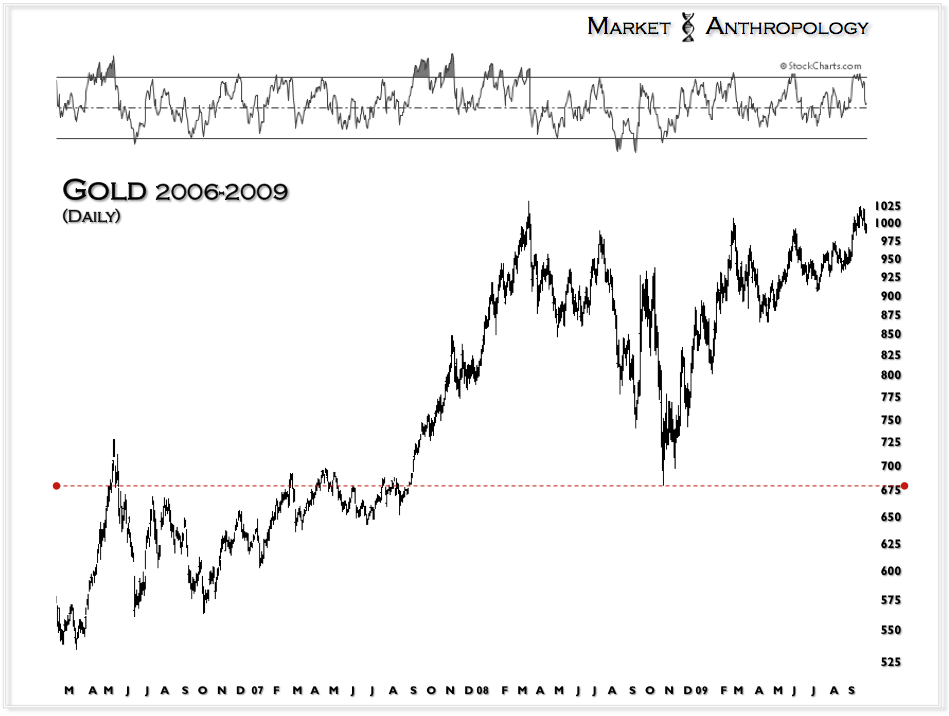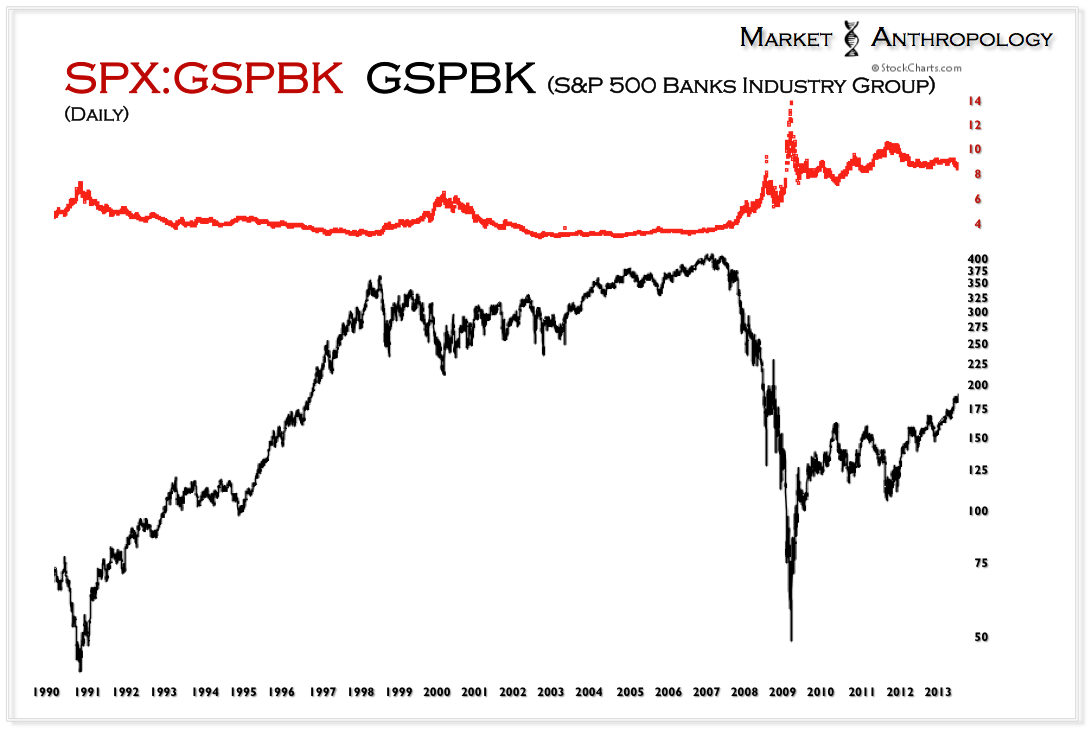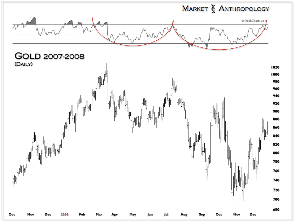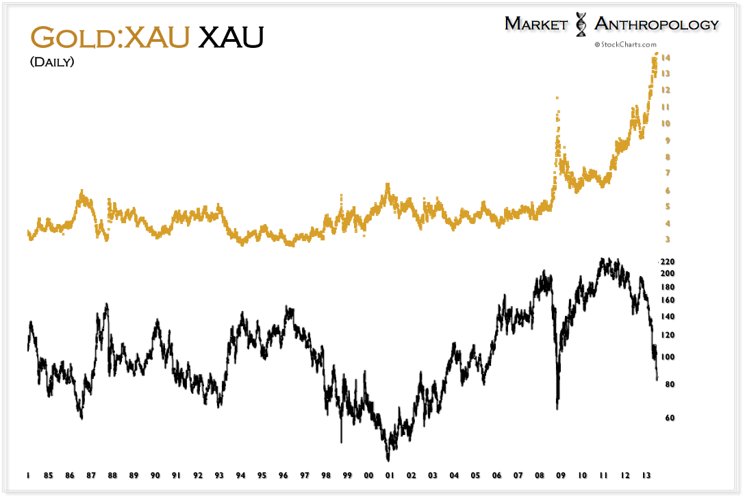 Despite marching to different rhythms, it has paid very well to buy both the banks and the miners when their respective ratio expressions (now flipped) have reached parabolic extremes. As noted in the first series, they have proportionally exhausted along similar lines. What is particularly interesting is the miners are completing the same exhaustion parallel that the banks navigated in the first half of 2009 – despite putting in a higher high and higher low. It had always bothered us while we were negative and short the sector that the miners had never strongly outperformed spot prices during the span of the entire bull market. Historically speaking – it was a rather large outlier. While outlandish as it seems right now – perhaps their best days are yet to come. Considering the write downs and efficiencies now dictated by current market conditions – lean and mean for the next leg higher just may provide those conditions.