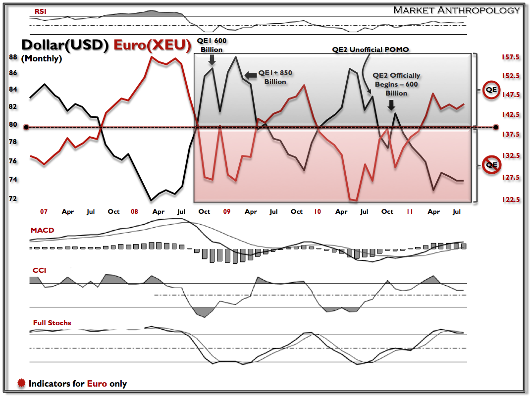 I believe it is logical to anticipate that the euro will follow a similar arc with the dollar during the active rounds of QE in which the currency is initially devalued. The question is at what point on the panic continuum will it be engaged and at what level in the equity markets. I believe the charts hold many of those clues and my best guesstimate is we bounce over the next several sessions to between 1230 to 1250 on the SPX before heading back down to around 1100 during the retest. It is likely at the secondary low that the European bazooka will be fired and market participants will reconstitute their appetite for risk.
