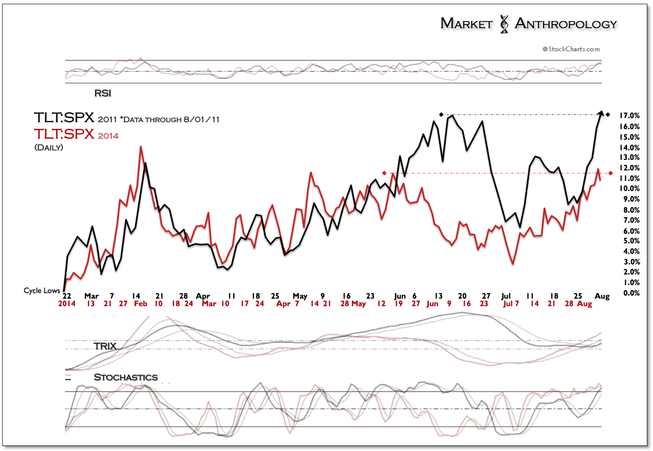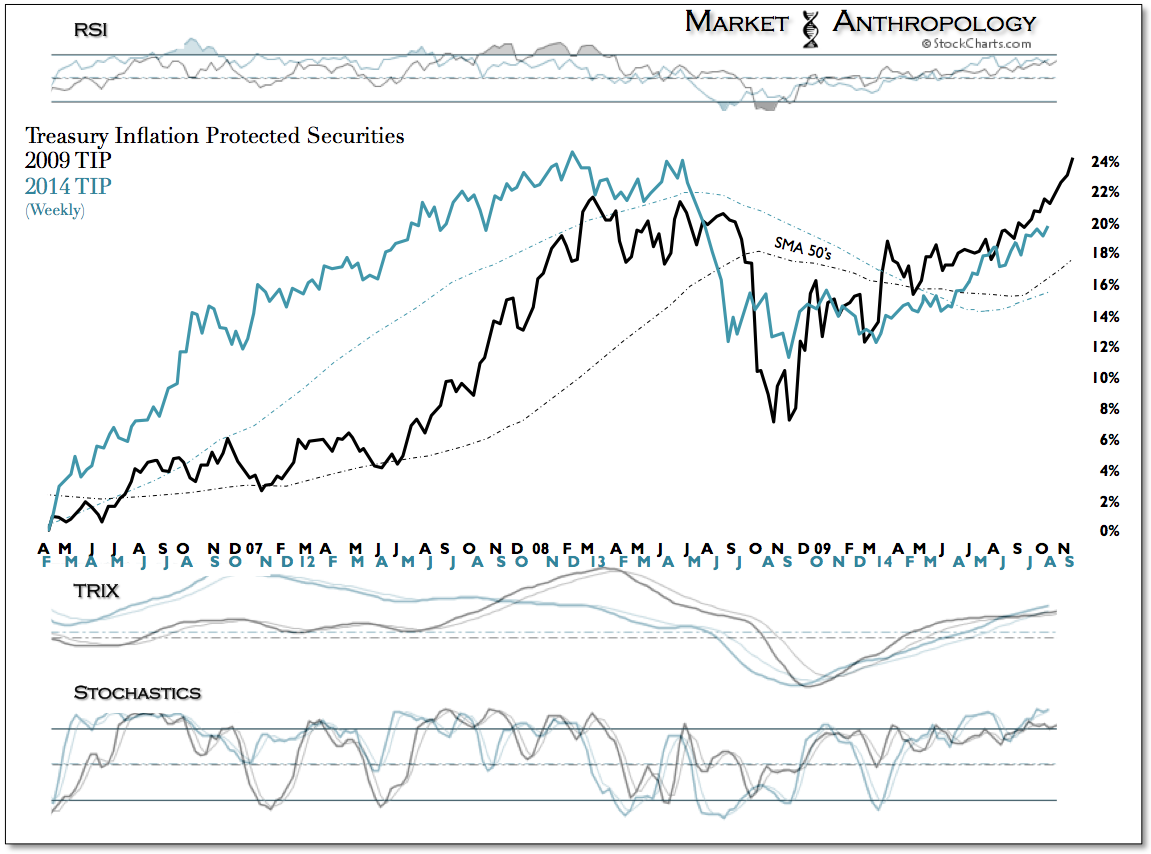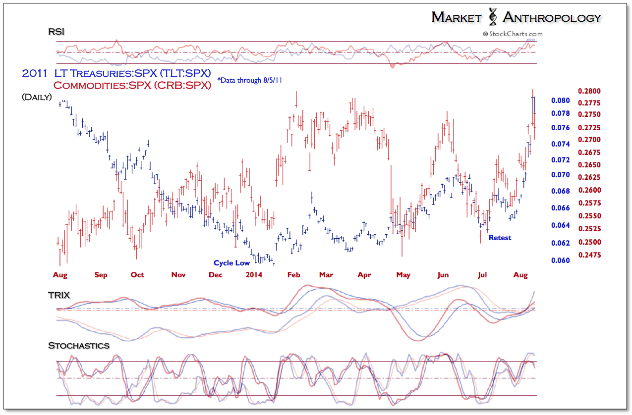 While there are parallels to the wind down of QEII in how long-term Treasuries relative to equities have performed this year, the biggest difference in our opinion – and one we cite as indication of effective demand with policy, is the fact that gold and the broader commodity complex based and pivoted out of a cyclical low last December when the Fed moved to taper. This was largely contrarian to what most participants believed would occur as the Fed walks away. From our perspective and as we had noted last year before the initial taper, these developments ring true if policy accommodations were being withdrawn a final time – and if underlying conditions were in place to sustain reflationary forces.