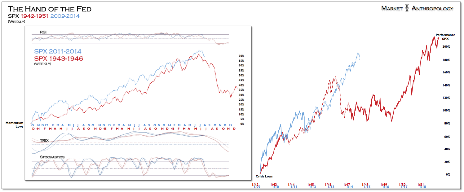 Just as the policy shifts by the Fed in the mid 1940’s sparked the unique conditions in which long-term yields declined with a rejuvenation in commodities and inflation (see Here), a similar dynamic has developed since last December in precious metals, commodities and those reflationary assets closely associated with their respective performance trends.