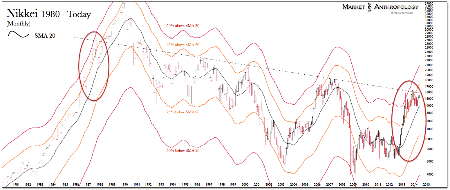 Right on cue with our equity cycle comparative with Japan – circa 1996, the events in Portugal last week helped extend the recent pivot lower in Spain’s equity markets, from what we expect was a cyclical high for the index in June. While the initiatives taken by the ECB over the past year pave the way towards additional stimulus in Europe, we do not believe it will be enough to overcome market conditions already stretched – both on an absolute basis and from a comparative perspective with deflation’s most recent prisoner.