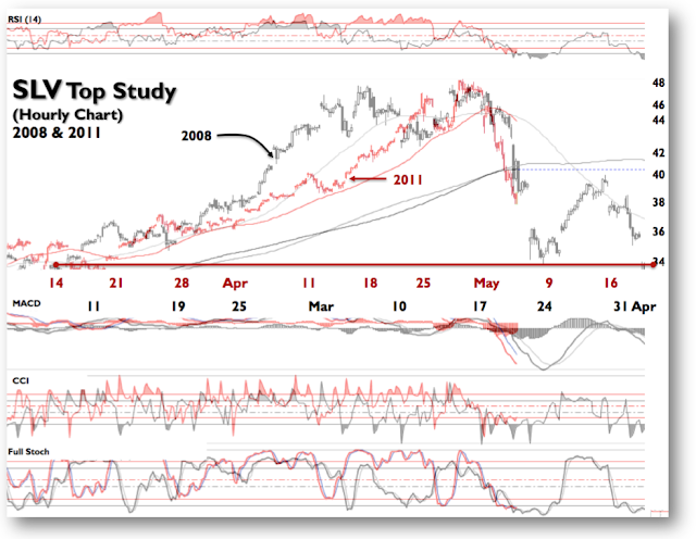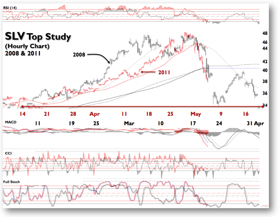 This is what the back side of a parabolic commodity market feels like. It’s reinforcing, violent and often temperamental. Just as you think the market is stabilizing, the ground falls out and the next level of support comes into view faster than my 7th month old devours a sliver of cantaloupe (he’s advanced – we’re very proud). It is why I reasoned just last Thursday when the market was sitting directly below the magic level of $50 an ounce that we could see SLV at $32 in the not too distant future.