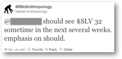 This is what the back side of a parabolic commodity market feels like. It’s reinforcing, violent and often temperamental. Just as you think the market is stabilizing, the ground falls out and the next level of support comes into view faster than my 7th month old devours a sliver of cantaloupe (he’s advanced – we’re very proud). It is why I reasoned just last Thursday when the market was sitting directly below the magic level of $50 an ounce that we could see SLV at $32 in the not too distant future.