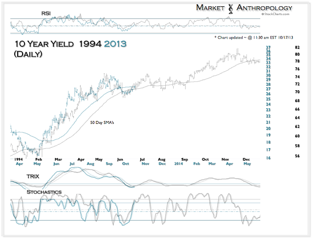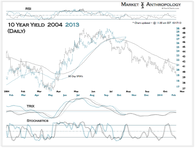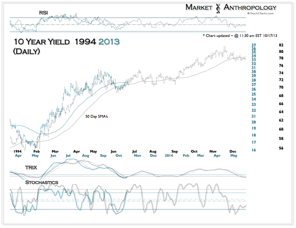 After breaking down in September, 10 year yields have crept up and kissed the backside of their 50 day moving average. From a reference perspective to the two previous cycles (94′ & 04′) in which the Fed rattled the markets with motions to withdraw monetary accommodations – there lies a fork in the comparative road.